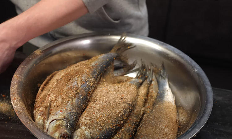 3. Насыпьте подготовленную смесь на рыбу, аккуратно распределяя по каждой тушке, особенно в местах разрезов. Легко втирайте специи пальцами в мякоть, чтобы ароматы проникли внутрь. Накройте миску крышкой или пленкой и поставьте в холодильник на 1 час. Это помогает специям раскрыть аромат и слегка «сделать» рыбу.