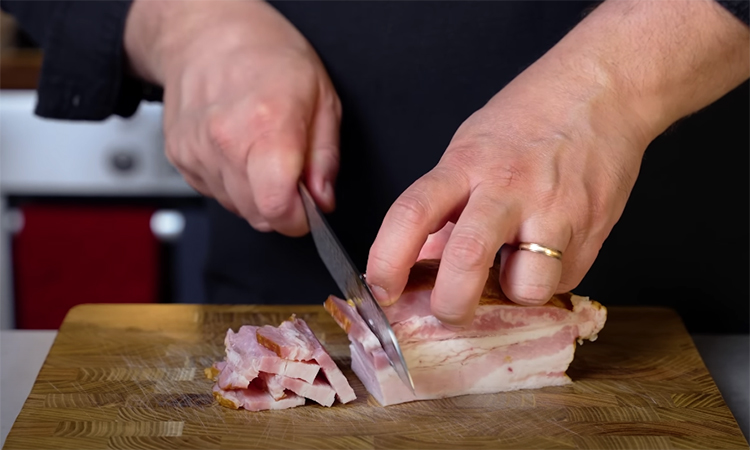 Картофель тщательно вымойте и варите в мундире до готовности. Немного остудите, очистите и нарежьте крупными ломтиками. Если используете мелкую картошку, просто разрежьте пополам. Бекон нарежьте кусочками толщиной около полсантиметра и шириной по 2–3 см. Разогрейте сухую сковороду и обжарьте бекон до золотистого цвета, пока не вытопится часть жира.