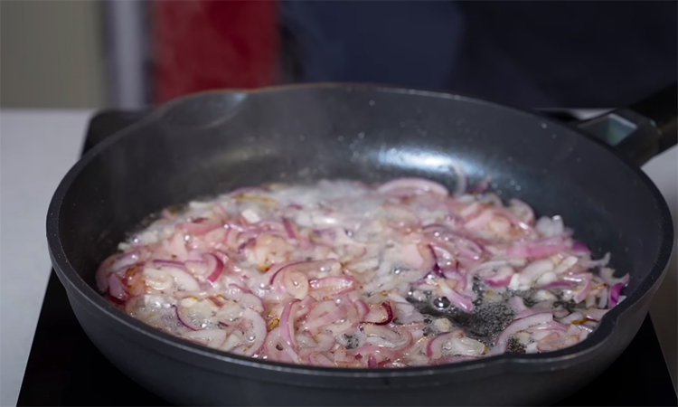 Переложите его на тарелку, а на оставшемся жире обжарьте нарезанный лук до мягкости и легкой карамельности. Добавьте измельченный чеснок и готовьте еще пару минут, чтобы ушла острота. Когда лук станет прозрачным и ароматным, влейте бульон, добавьте уксус, сахар и немного соли. Перемешайте и выпарите жидкость, пока она не станет густой и тягучей.