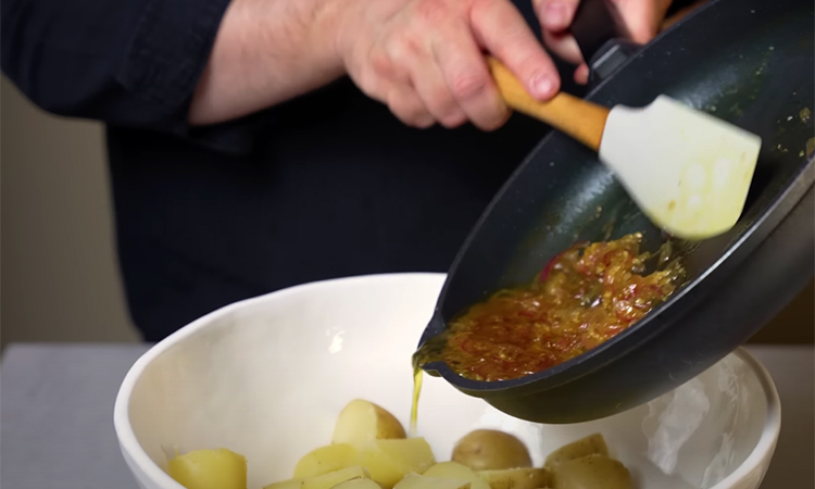 Картофельный салат по-немецки и в классическом варианте получается вкусным. В Грузии этот рецепт сумели довести до идеала, изменив пару важных деталей. В новом варианте бекон обжаривается до румяной корочки, лук карамелизуется, а нежный беби-картофель впитывает ароматную заправку с уксусом и бульоном. Вкус получается глубоким, насыщенным, с легкой кислинкой и ароматом зелени — то, что нужно для уютного домашнего ужина.