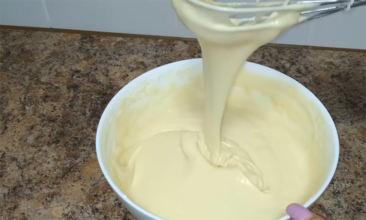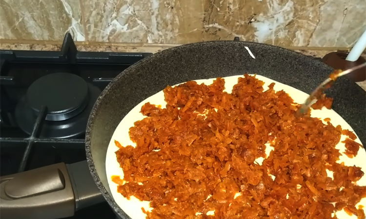 Для теста взбейте яйца с сахаром, добавьте соль, растительное масло и тёплый кефир. Всыпьте соду, перемешайте, постепенно добавьте муку и доведите до густоты густой сметаны. Сковороду диаметром 26 см застелите пергаментом, вылейте половину теста, распределите его по дну и выложите всю начинку. Сверху залейте оставшимся тестом и разровняйте поверхность.