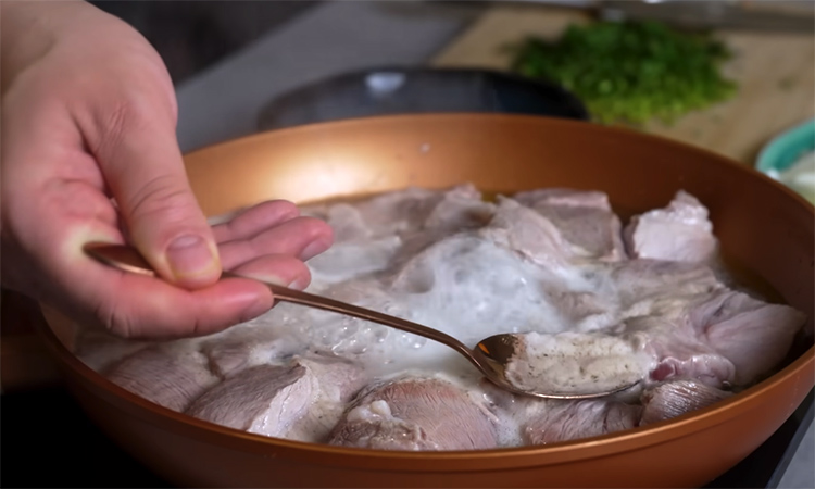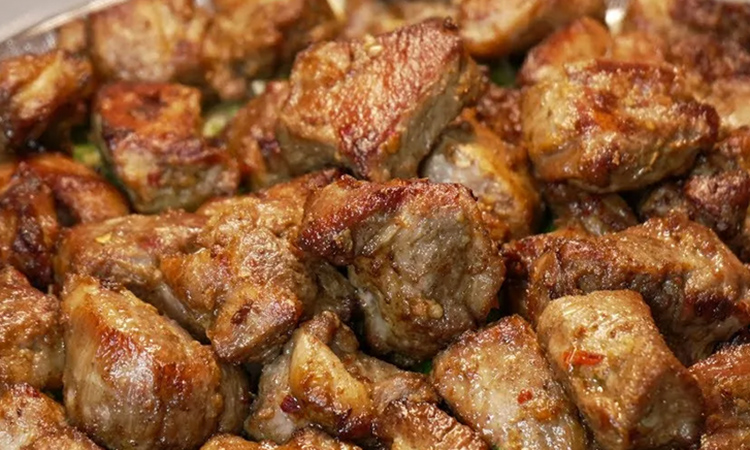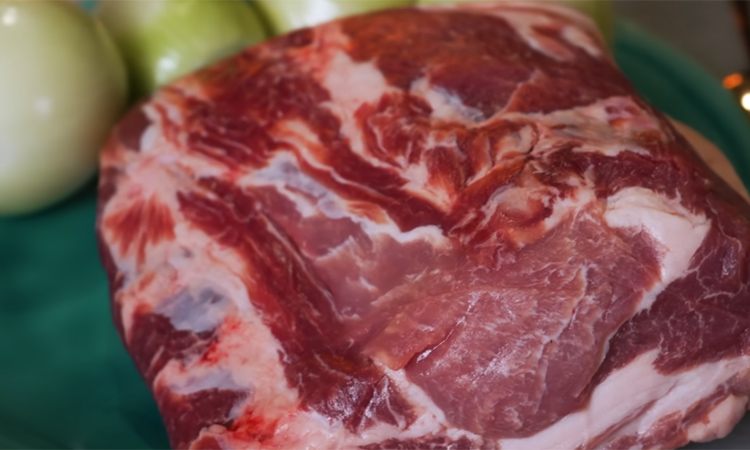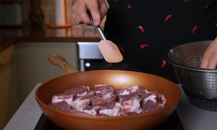 Свинину нарезают крупными кусками, примерно как для шашлыка. Куски тщательно промывают под холодной водой не меньше пяти минут, чтобы убрать возможную темную пену, которая потом даст неприятный цвет. Мясо откидывают на сито, дают воде стечь. На плиту ставят глубокую сковороду или казан, кладут ложку топлёного масла и растапливают. В разогретое масло отправляют всё мясо сразу — не порциями, потому что на этом этапе оно не жарится, а тушится.