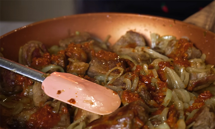 Через сорок минут тушения снимают крышку, ждут, пока жидкость почти полностью выпарится, и начинают часто помешивать мясо, чтобы оно слегка подрумянилось. К поджаренной свинине добавляют лук, перемешивают, дают ему стать мягким и прозрачным.