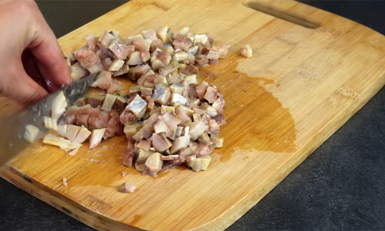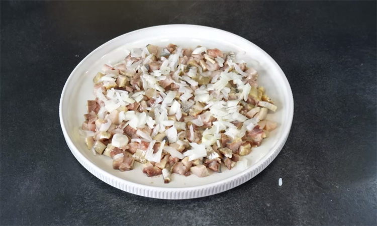 Нарежьте слабосоленую сельдь небольшими кубиками, стараясь сохранить ровную форму кусочков, и выложите их на тарелку, слегка распределяя по поверхности. Очистите луковицу, нарежьте ее мелкими кусочками и равномерно распределите поверх сельди, затем сбрызните растительным маслом, чтобы смягчить остроту и добавить аромата.