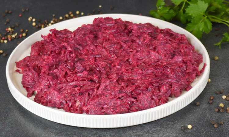 Свекла в этом салате дает мягкую сочность, а слабосоленая сельдь добавляет глубину вкуса, формируя сбалансированную композицию. Контраст текстур делает блюдо выразительным и одновременно очень цельным. Лук в сочетании с маслом подчеркивает вкус рыбы и усиливает аромат, создавая прочную основу для свекольного слоя. Это один из лучших новогодних салатов, он напоминает сельдь под шубой, только без утомительного выкладывания слоев.