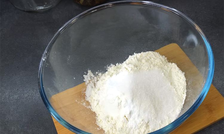 Смешайте муку, разрыхлитель, соль и сахар, затем отмерьте масло тем же стаканом и влейте его в сухую смесь. Долейте в стакан кипяток, чтобы суммарный объем заполнил оставшееся пространство, сразу вылейте горячую жидкость в миску и аккуратно перемешайте ложкой, чтобы смесь объединилась. Переложите тесто на стол, замесите руками до гладкой структуры и оставьте на десять-пятнадцать минут, чтобы оно стало более податливым.