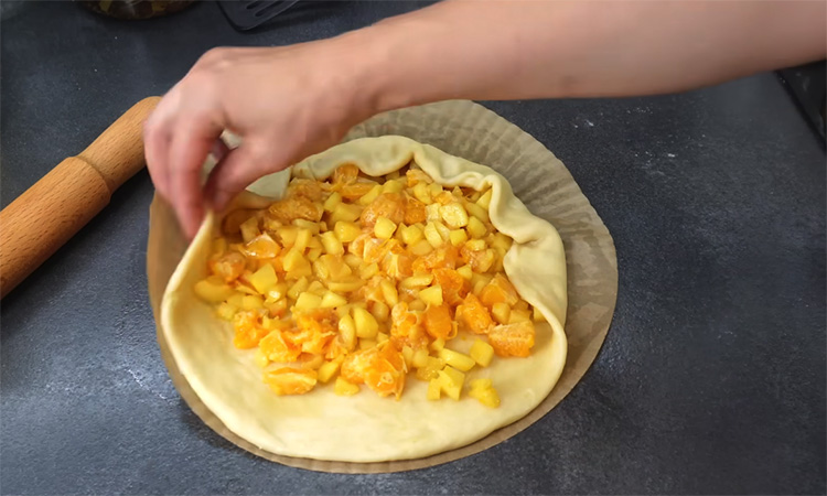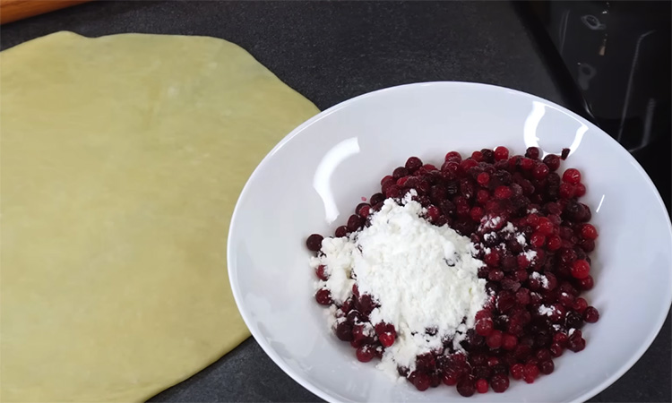 Пока тесто отдыхает, подготовьте фруктовую начинку: очистите яблоки, нарежьте их кубиками, недолго протушите на сковороде, затем добавьте нарезанные мандарины и сахар, доведите до испарения жидкости и охладите. Для второй начинки соедините бруснику с крахмалом и сахаром, перемешайте до равномерного распределения.