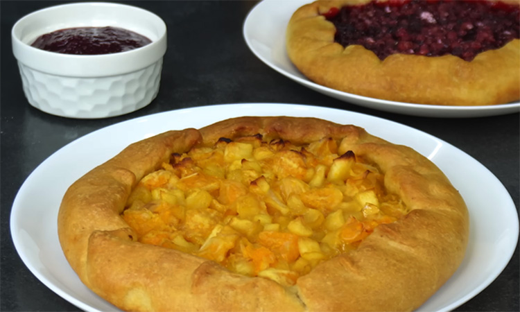 Обомните тесто, разделите его на две части и раскатайте каждый кусок сразу на пергаменте, формируя круглые пласты. Выложите первую начинку в центр, оставьте свободные края и заверните их внутрь, легко прижимая, чтобы они закрепились. Повторите то же с брусничной начинкой, сформируйте вторую галету и перенесите их на противень. Выпекайте при 180 градусах тридцать пять-сорок минут.
