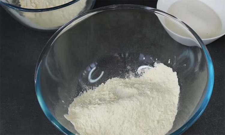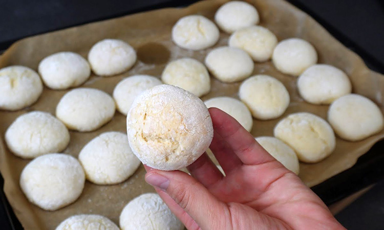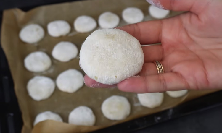 В оставшиеся 200 г муки вмешайте разрыхлитель и отправьте эту смесь в миску, замесите мягкое тесто, которое остается слегка липким, при сильной липкости подсыпьте буквально щепотку муки, но не забивайте массу. Разделите тесто на кусочки примерно по 30 г, скатайте шарики, слегка прижмите ладонью и при помощи кружки сформуйте аккуратные шайбы.
