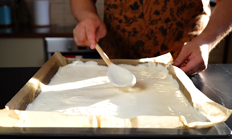 3. Разогрейте духовку до 180 °C. Форму или противень застелите пергаментной бумагой. Вылейте тесто, аккуратно распределите его по поверхности слоем одинаковой толщины и отправьте в духовку на 10 минут, чтобы основа схватилась и слегка подрумянилась.