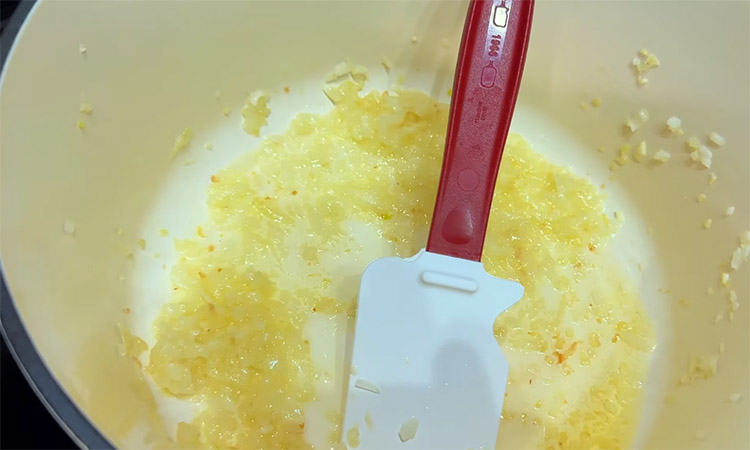 Нарежьте репчатый лук как можно мельче и измельчите чеснок ножом. Разогрейте в кастрюле с толстым дном сливочное масло вместе с растительным и обжарьте на нем лук с чесноком до легкой золотистости. Всыпьте пшеничную муку к овощам и прогрейте ее на медленном огне пару минут, постоянно помешивая лопаткой.
