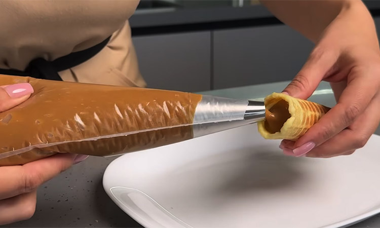 Переложите начинку в кондитерский мешок и плотно заполните каждую остывшую трубочку с обеих сторон. Обмакните края в измельченные орехи и уберите десерт в холодильник на несколько часов для стабилизации.