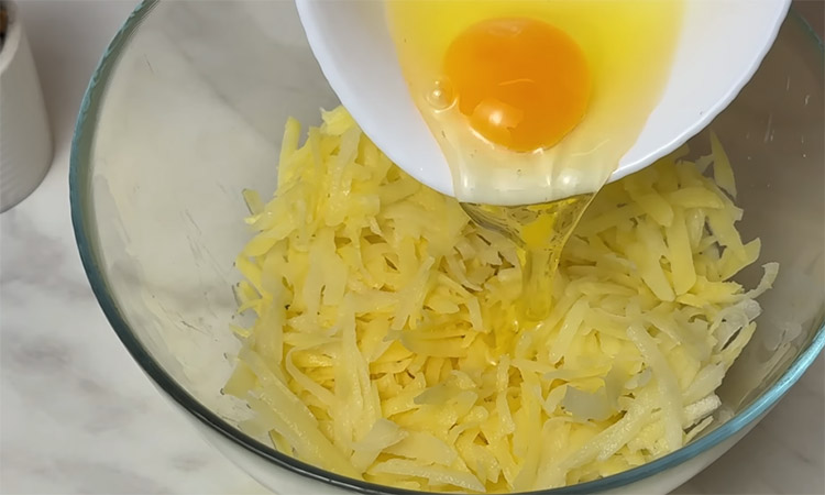 Очистите картофель и натрите его на крупной терке в глубокую миску. Разбейте одно яйцо, добавьте его к картофельной массе, посолите по вкусу и тщательно перемешайте все компоненты. Разогрейте сковороду на медленном огне, влейте немного растительного масла и выложите картофельную смесь.