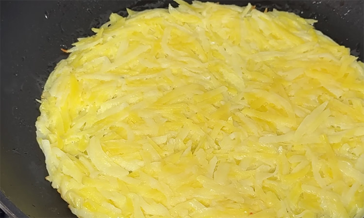 Сразу после этого разбейте второе яйцо прямо сверху на картофельную лепешку, стараясь не повредить желток. Посолите яйцо, добавьте немного черного перца и снова закройте сковороду крышкой на четыре-пять минут.