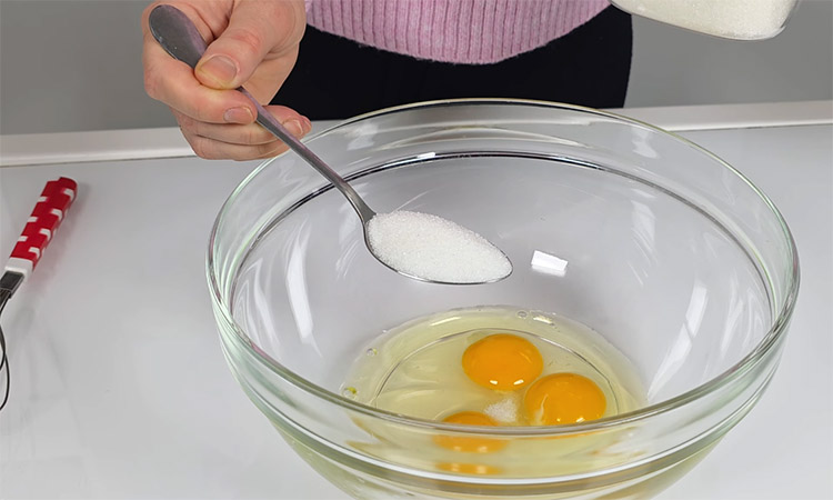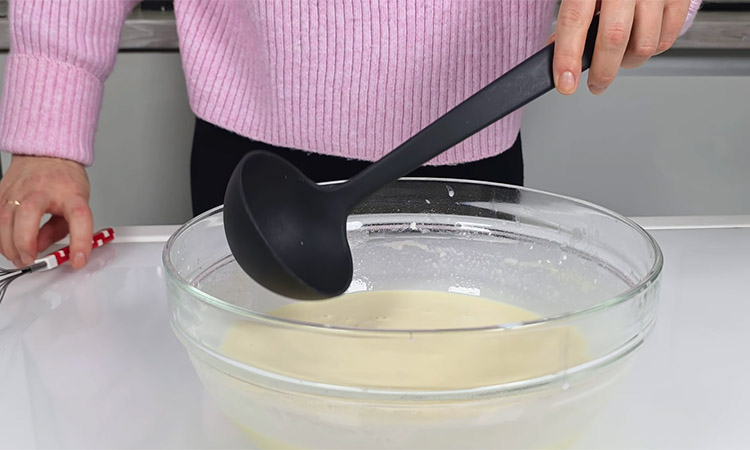 Разбейте яйца в глубокую миску, добавьте соль и сахар, после чего взбейте венчиком до появления легкой белой пены. Влейте примерно половину молока комнатной температуры и снова перемешайте массу до однородности. Смешайте муку с кукурузным крахмалом и введите эту смесь в яично-молочную основу в два приема, тщательно разбивая все комочки венчиком.