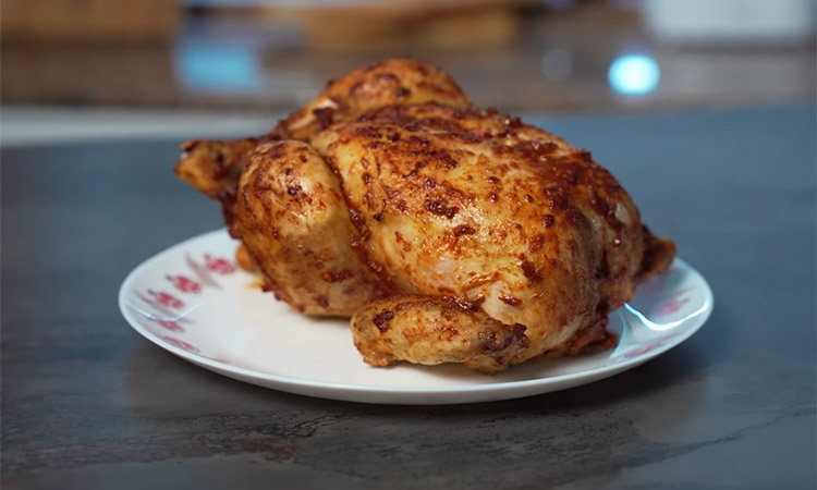 Тщательно натрите курицу полученной смесью снаружи и внутри, распределяя соус равномерным слоем. Поместите курицу в разогретую до 220 градусов духовку на 10 минут, затем убавьте температуру до 180 градусов и запекайте еще 25 минут. Каждые 10 минут доставайте противень и поливайте тушку вытопившимся жиром для получения идеальной корочки.