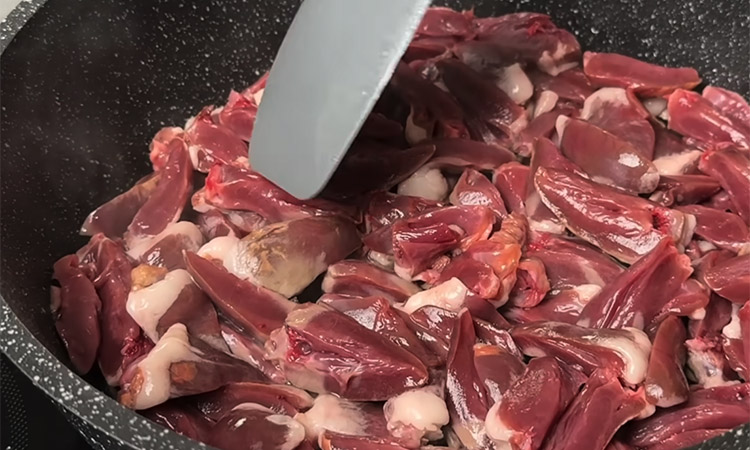 Очистите индюшачьи сердечки от лишнего жира, разрежьте каждое на четыре части и тщательно промойте под проточной водой от сгустков крови. Мелкие шампиньоны оставьте целыми, а крупные грибы разрежьте на половинки или четвертинки. Разогрейте сковороду с растительным маслом и обжарьте грибы на сильном огне до появления золотистого цвета, после чего переложите их на отдельную тарелку.