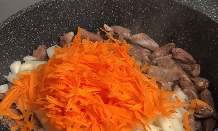 На той же сковороде обжарьте обсушенные бумажными полотенцами сердечки до румяной корочки. Нарежьте репчатый лук кубиком, морковь натрите на крупной терке и отправьте овощи к мясу. Посолите ингредиенты, залейте горячей водой и тушите под закрытой крышкой на медленном огне в течение тридцати минут. Спустя указанное время верните обжаренные грибы в сковороду к сердечкам и продолжайте тушение.