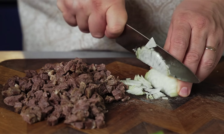 Возьмите большую миску, чтобы было удобно перемешивать продукты и не давить их. Нарежьте отварную морковь мелким кубиком, а картофель подготовьте кубиками среднего размера. Измельчите вареные яйца так, чтобы кусочки были примерно в два раза меньше картофеля. Нарежьте отварную говядину аккуратными кубиками того же размера, что и яйца.