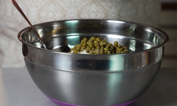 Всыпьте зеленый горошек, добавьте соль, черный перец и щепотку острого перца по вкусу. Аккуратно перемешайте все ингредиенты ложкой и добавьте оставшийся майонез, чтобы салат стал нужной густоты.