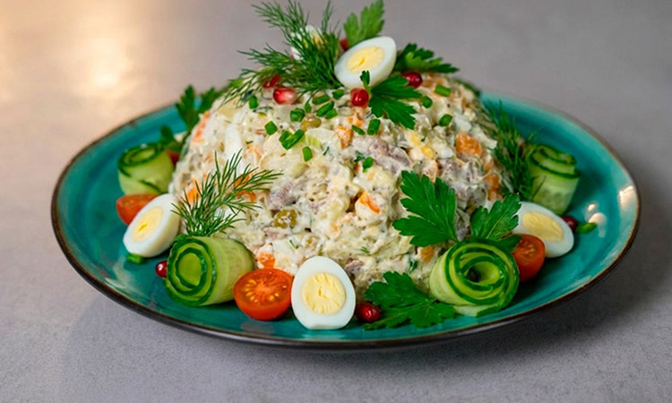 Вкусный мясной салат требует внимательного отношения к нарезке и качеству мяса. Отварная говядина намного лучше сочетается с овощами, чем обычная колбаса, поэтому и Оливье в кавказском стиле получается вкуснее привычного. Свежая зелень и небольшое количество репчатого лука делают аромат более насыщенным и аппетитным. Правильная обработка маринованных огурцов позволяет салату долго оставаться густым и не стекать в тарелке, а всю картину дополняет пикантная заправка.