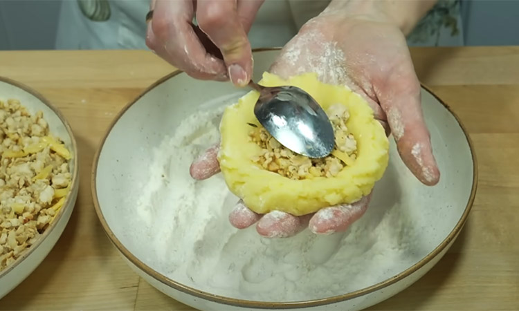 Припылите руки и рабочую поверхность мукой, возьмите столовую ложку картофельного теста и сформируйте на ладони лепешку. Выложите в центр ложку остывшей начинки, аккуратно защипните края, формируя продолговатую котлетку, и обваляйте ее в муке.