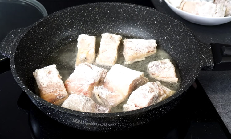 Очистите скумбрию от внутренностей, удалите головы и хвосты, затем отделите филе от хребта, оставляя кожицу на месте. Нарежьте полученное филе на небольшие порционные кусочки, посолите их по вкусу и тщательно перемешайте. Насыпьте муку в пакет, положите туда рыбу и встряхните, чтобы каждый кусочек равномерно покрылся тонким слоем муки.
