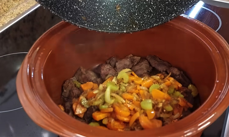 Перловую крупу заранее хорошо промойте и замочите в воде на ночь, чтобы она стала мягче. Нарежьте говядину небольшими кусочками и обжарьте на сильном огне в смеси растительного и сливочного масел до румяной корочки. Переложите обжаренное мясо в кастрюлю или сотейник с толстым дном, стараясь оставить жир в сковороде. В этой же сковороде обжарьте мелко нарезанный лук с чесноком, затем добавьте морковь и сельдерей, потушите всё вместе несколько минут.