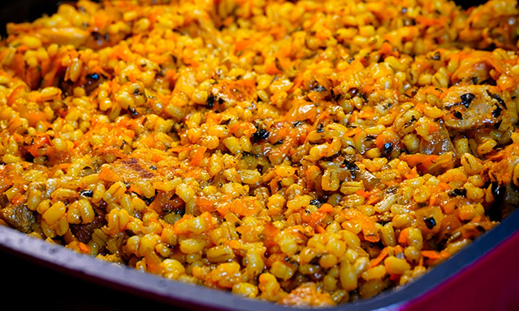 Сухой рассольник по вкусу напомнит скорее сытное, аппетитное рагу, бульона здесь совсем нет. Мясо после долгого томления получается мягким как масло, сама каша впитывает все соки, пропитываясь мясными соками и ароматом овощей. Добавление сельдерея и чеснока придает блюду пряный аромат, который делает простую крупу ресторанным деликатесом.