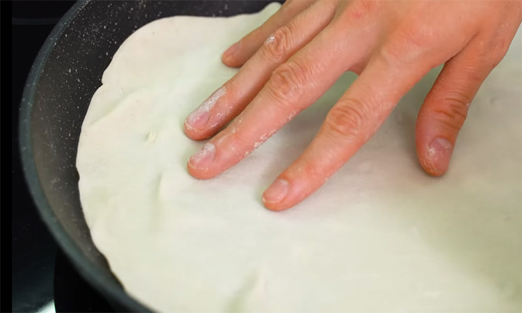 Для получения идеальной формы вырежьте ровный круг с помощью крышки от кастрюли подходящего диаметра. Выложите заготовку на сухую, хорошо разогретую сковороду и жарьте на огне чуть выше среднего по 20–30 секунд с каждой стороны.