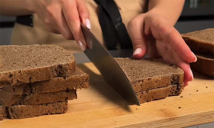 Разрежьте крупные куски бородинского хлеба пополам или по диагонали, чтобы получились аккуратные треугольники. Застелите противень бумагой для выпечки, выложите на него хлеб и отправьте в разогретую до 180 градусов духовку на пять минут. Следите, чтобы хлеб только слегка подсушился сверху и схватился корочкой, но остался мягким внутри.