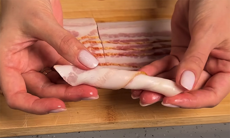 Остудите готовые заготовки и тщательно натрите каждый кусочек с одной стороны долькой свежего чеснока. Нарежьте маринованные огурцы тонкими кружочками. Полоски сырокопченого бекона разрежьте пополам и сверните каждую часть в плотную трубочку по диагонали.