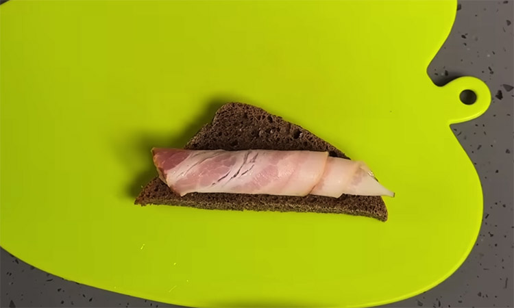 Выложите на одну сторону хлебного треугольника трубочку бекона, а на другую — несколько кружочков огурца.