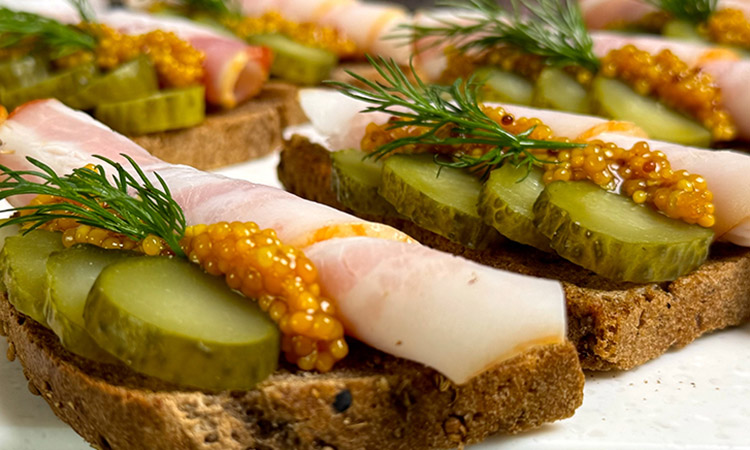 Когда нужно быстро собрать праздничный стол или приготовить закуску для гостей, такие бутерброды станут отличным решением. Мы возьмем ароматный бородинский хлеб, слегка подсушим его в духовке до легкой корочки и натрем свежим чесноком для резкого, аппетитного запаха. Главный вкус здесь создают полоски сырокопченого бекона и кружочки маринованного огурца, которые идеально сочетаются с черным хлебом. Это простая и понятная еда, на приготовление которой уйдет не больше пяти минут, вместо бекона можно взять любую колбасу или то, что уже есть в холодильнике.