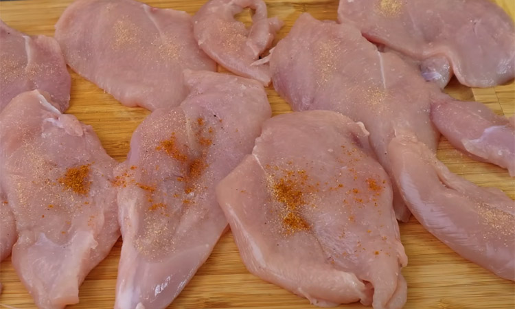 Разрежьте куриную грудку вдоль на две части и приправьте солью, сушеным чесноком и специями для курицы с обеих сторон. Оставьте мясо на несколько минут, затем тщательно обваляйте каждый кусок в муке. Разогрейте растительное масло в глубокой сковороде и быстро обжарьте филе на большом огне до образования золотистой корочки, чтобы запечатать сок внутри.