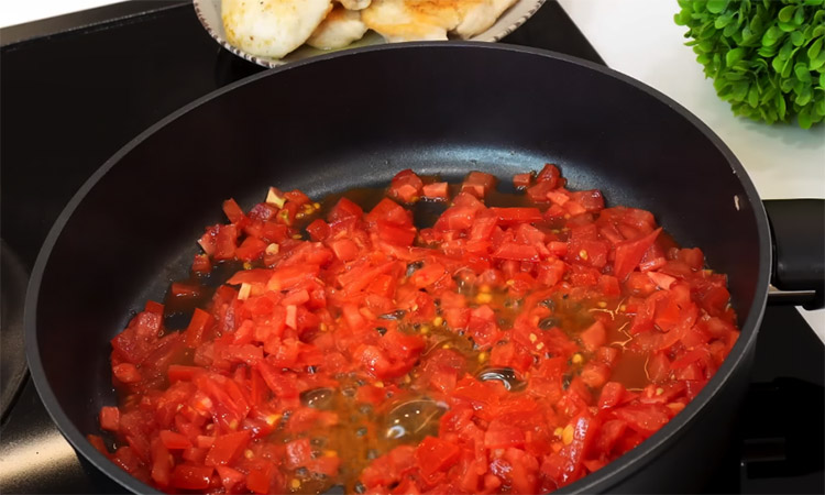 Извлеките мясо и на этой же сковороде обжарьте мелко порубленный свежий чеснок до появления аромата. Добавьте нарезанные кубиками помидоры и тушите их пару минут до мягкости. Влейте в сковороду сливки, посолите, поперчите и дождитесь закипания соуса.