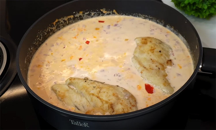 Убавьте огонь до минимума, верните обжаренное филе в соус и томите под крышкой в течение пятнадцати минут.