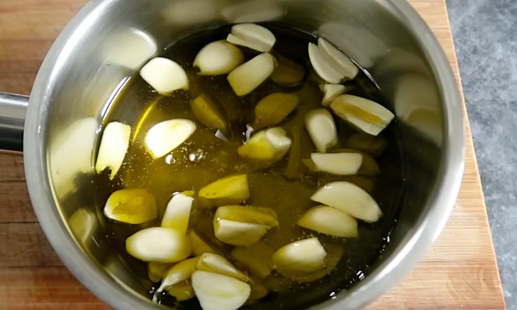 1. Очистите зубчики чеснока. Если зубчики крупные, разрежьте каждый на 2–3 части. Это позволит чесноку быстрее и равномернее пропитаться маслом и специями. Переложите подготовленный чеснок в сотейник, так чтобы кусочки лежали в один слой. Полейте чеснок оливковым маслом — оно должно слегка покрывать все кусочки, чтобы они равномерно жарились.