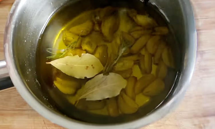 2. Поставьте сотейник на маленький огонь. Готовьте чеснок около 10 минут, периодически аккуратно помешивая, чтобы он не пригорел. К этому времени чеснок начнет становиться мягким и прозрачным, а масло — ароматным. Добавьте в сотейник розмарин и лавровый лист. Продолжайте готовить чеснок ещё 10 минут на медленном огне, чтобы травы раскрыли свой аромат. Чеснок должен стать золотистым и мягким, масло — насыщенным ароматом чеснока и трав.