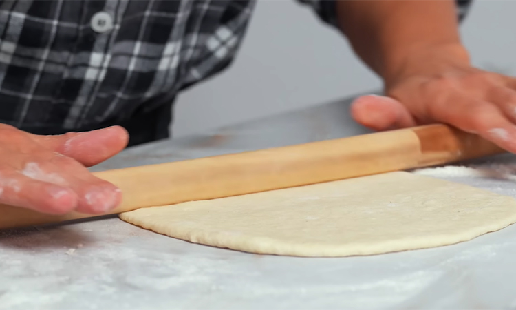 Для начинки натрите сулугуни на крупной терке, смешайте со вторым яйцом и сформируйте из полученной массы четыре плотных шарика. Разделите отдохнувшее тесто на четыре равные части, каждую из которых округлите и раскатайте в небольшой тонкий круг на присыпанной мукой поверхности. Поместите сырный шарик в центр каждой заготовки, плотно соберите края теста сверху в узелок и аккуратно прижмите ладонью.