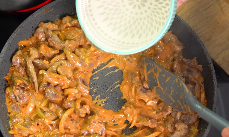 Переложите лук в сторону, а часть ароматного масла оставьте для мяса. Обжаривайте говядину небольшими порциями в один слой на сильном огне по 1–2 минуты с каждой стороны, добиваясь легкой корочки без выделения сока. Переложите готовое мясо к луку и держите под крышкой, чтобы сохранить тепло. Для соуса в этой же сковороде при необходимости добавьте немного воды или вина, чтобы снять прижаренные частицы со дна. Введите сливочное масло, затем добавьте 30 г муки и быстро перемешайте.