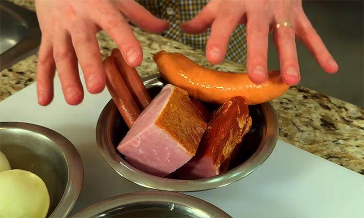 В кастрюле с толстым дном разогрейте растительное масло и обжарьте мелко нарезанный лук до мягкости и легкой прозрачности. Добавьте измельченный чеснок и прогрейте несколько секунд до появления аромата. Введите томатную пасту и готовьте на слабом огне около пяти минут, чтобы она изменила цвет и раскрыла вкус. Нарежьте сосиски, колбаски, грудинку и копченую вырезку разными способами — кружочками, соломкой или полукольцами — и отправьте к томатной основе.