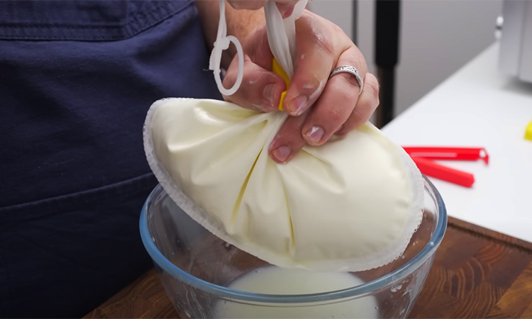 3. Под дуршлаг поставьте глубокую миску, чтобы собирать сыворотку, которая будет стекать из йогурта. Заверните йогурт в марлю так, чтобы края марли были над миской, и поместите в холодильник. Оставьте минимум на 24 часа. За это время лишняя жидкость полностью стечет, а йогурт превратится в плотный, кремовый сыр.