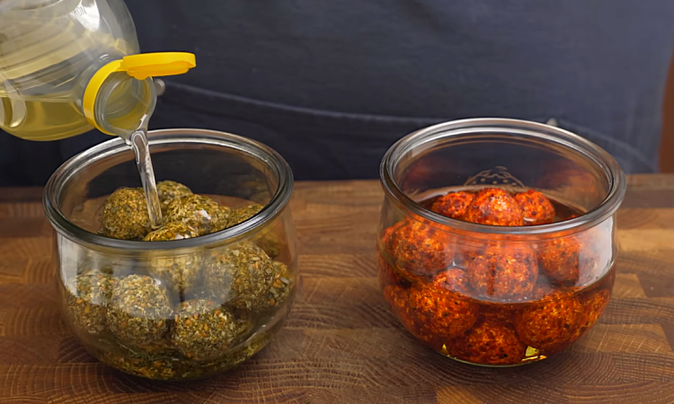 5. Если вы хотите хранить сыр подольше и добавить аромат, переложите шарики в стеклянную банку. Залейте их оливковым маслом, чтобы оно полностью покрывало сыр, и добавьте специи по вкусу. Банку закройте крышкой и храните в холодильнике. Так сыр будет пропитан маслом и ароматами специй, что делает его вкус более насыщенным.
