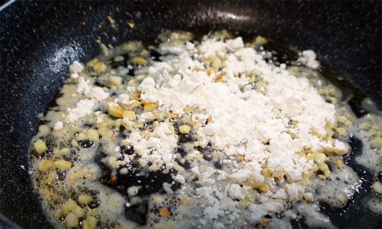 1. Разогрейте сковороду на среднем огне и растопите в ней сливочное масло до мягкости, чтобы оно слегка запенилось и стало ароматным. Крупно нарежьте чеснок и положите его в масло. Обжаривайте, помешивая, 1–2 минуты, пока чеснок не отдаст свой аромат, но не подгорит. Насыпьте муку прямо в сковороду с чесноком и маслом. Постоянно помешивайте, чтобы мука прогрелась и слегка подрумянилась — это придаст соусу нежный ореховый оттенок и поможет ему загустеть.