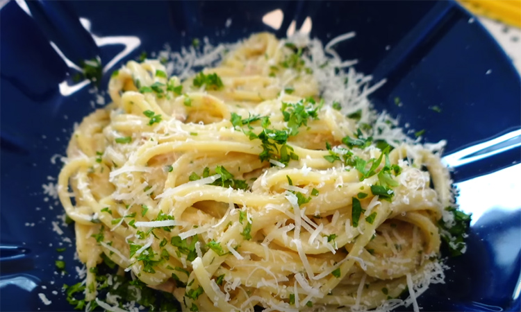 5. Посыпьте сверху тертым сыром. Дайте ему расплавиться на горячих спагетти, образуя тонкую тянущуюся корочку. Подавайте блюдо сразу же, украсив веточкой свежей петрушки, чтобы подчеркнуть цвет и аромат.