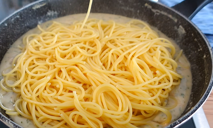 4. Пока готовится соус, отварите спагетти в большом количестве подсоленной воды до состояния аль денте. Они должны быть мягкими снаружи, но сохранять лёгкую упругость внутри. Слейте воду и сразу же переложите спагетти в сковороду с соусом. Тщательно перемешайте, чтобы каждая нить макарон покрылась ароматной сливочно-винной смесью с тунцом.