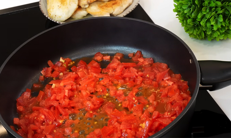 Посолите, добавьте сушеный чеснок и приправу, равномерно распределите специи и оставьте на 2–3 минуты. Обваляйте филе в муке, стряхните излишки. Разогрейте растительное масло в глубокой сковороде и обжарьте грудку на сильном огне с двух сторон до румяной корочки, не доводя до полной готовности, затем переложите на тарелку. Мелко нарежьте чеснок и помидоры. В той же сковороде добавьте немного масла, обжарьте чеснок до появления аромата, затем добавьте помидоры или томатную пасту с водой, прогрейте 1–2 минуты.