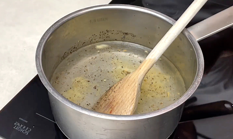 1. Очистите зубчики чеснока и удалите зеленые части внутри, чтобы суп не получился горьким. Затем измельчите чеснок ножом. Поставьте кастрюлю на средний огонь и растопите в ней выбранный жир: утиный, свиной или растительное масло. Жир должен равномерно покрыть дно кастрюли, чтобы чеснок не подгорел. Выложите измельчённый чеснок в разогретый жир. Обжаривайте на среднем огне, постоянно помешивая, до появления приятного аромата. Важно не допустить сильного зарумянивания — чеснок не должен горчить.