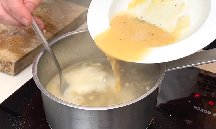 3. В отдельной миске слегка взбейте желток вилкой. Когда суп закипит, добавьте к желтку немного горячего бульона и тщательно перемешайте. Затем медленно влейте смесь в кастрюлю, постоянно помешивая, чтобы желток равномерно распределился и не свернулся комочками. Это придаст супу мягкую, слегка кремовую текстуру.